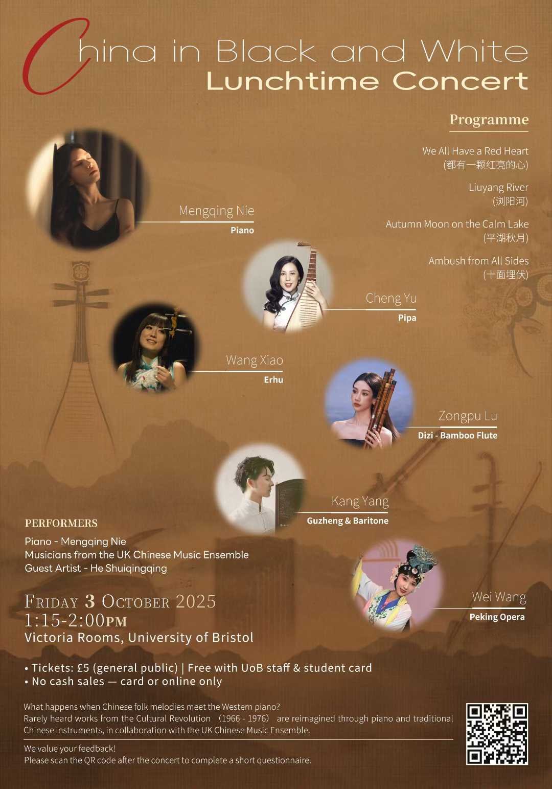 On Friday, 3 October 2025, pianist Mengqing Nie, a doctoral researcher at the University of Bristol, will collaborate with Prof Cheng Yu and the other musicians from the London Youlan Qin Society in a special lunchtime concert titled “China in Black and White.”
