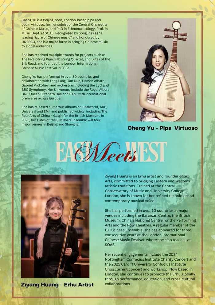 Cheng Yu has been invited to perform alongside Erhu artist Ziyang Huang (UK Chinese Music) and international chamber musicians, presenting iconic works that highlight cross-cultural dialogue and artistic collaboration.